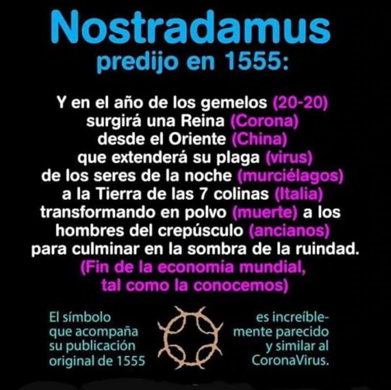 En las redes circula un texto atribuido al médico y astrólogo francés Michel de Notre-Dame, según el cual habría anticipado esta pandemia, entre las casi mil profecías que formuló.