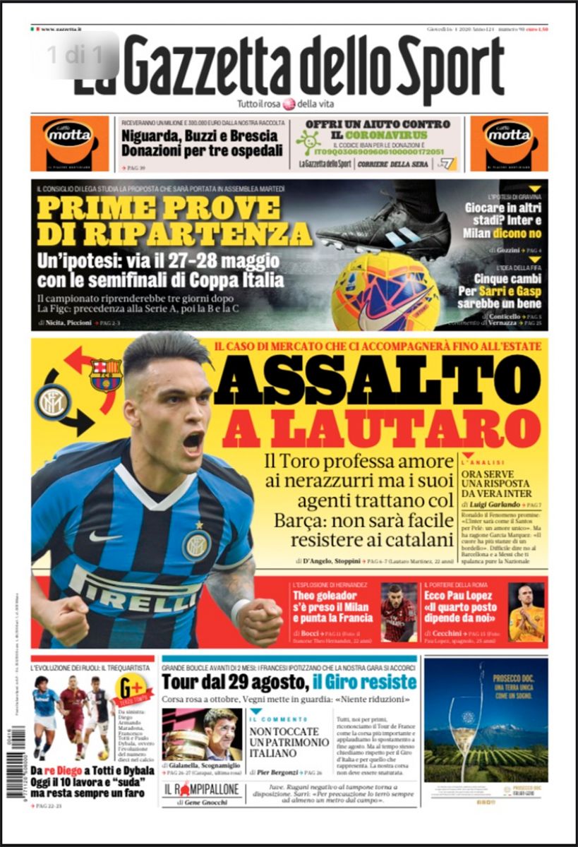 La Gazzetta dello Sport titula "Asalto a Lautaro" describiendo la manera en que el club catalán va por el ex Racing y resaltando la necesidad de que el equipo del norte italiano debería buscar al reemplazante.