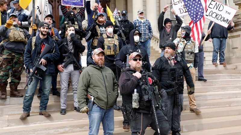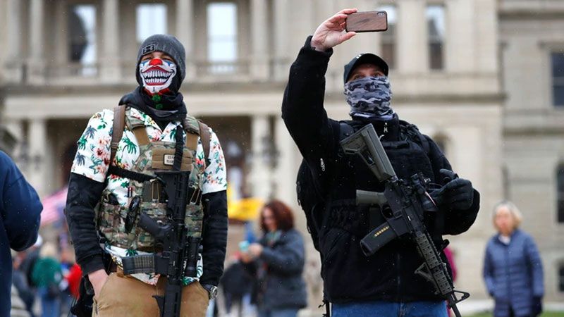 Miles de manifestantes -algunos de ellos fuertemente armados- se reunieron el miércoles en el Capitolio estatal de Michigan, en la ciudad de Lansing, para protestar contra la orden de permanecer en los hogares impuesta por la gobernador Gretchen Whitmer, bloqueando la circulación de las calles con sus vehículos.