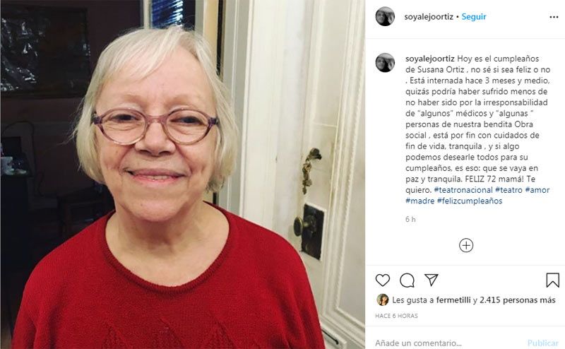 Horas antes de su partida, su hijo Alejo había compartido un posteo con una foto de ella para saludarla por su cumpleaños y para contar que desde hacía tiempo no la estaba pasando bien. En su texto, de alguna manera él se despide: “Hoy es el cumpleaños de Susana Ortiz , no sé si sea feliz o no. Está internada hace 3 meses y medio, quizás podría haber sufrido menos de no haber sido por la irresponsabilidad de algunos médicos y algunas personas de nuestra bendita Obra social”.