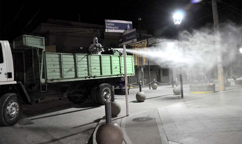 En primer término, el vehículo realizó un recorrido por calle Alem, Rivadavia, España, Sarmiento y las semipeatonales Sarmiento y Pellegrini, desinfectando veredas y fachadas de cada local y edificio. Luego se trasladó hasta la avenida Belgrano donde realizó la misma tarea.