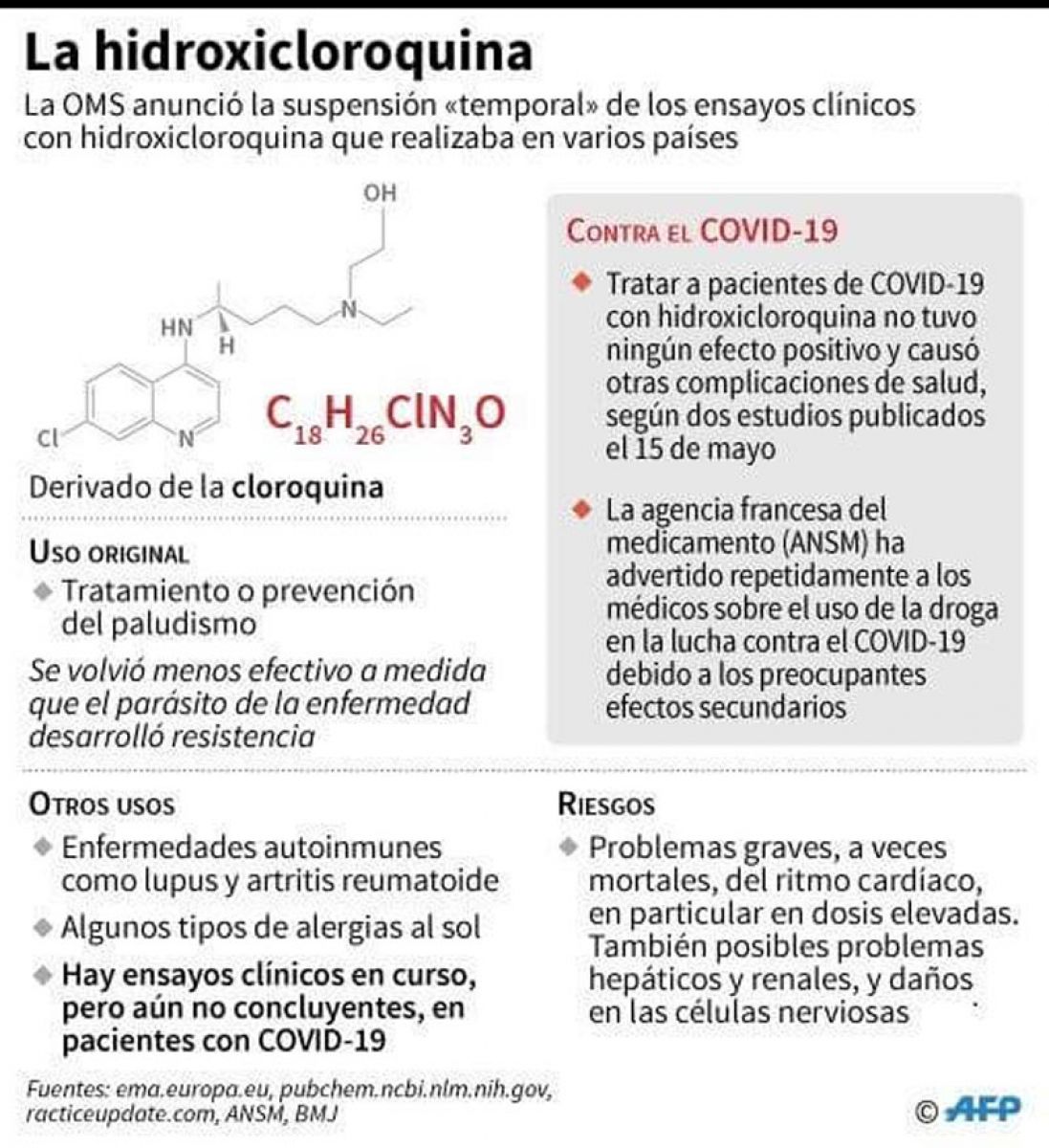 La decisión, una medida preventiva que podría ser revisada, se toma tras la publicación el pasado viernes en la revista médica The Lancet de un estudio en el que se señalaban mayores tasas de mortalidad en pacientes en los que se habían ensayado tratamientos con hidroxicloroquina, usada habitualmente contra la malaria, según un cable de la agencia EFE.