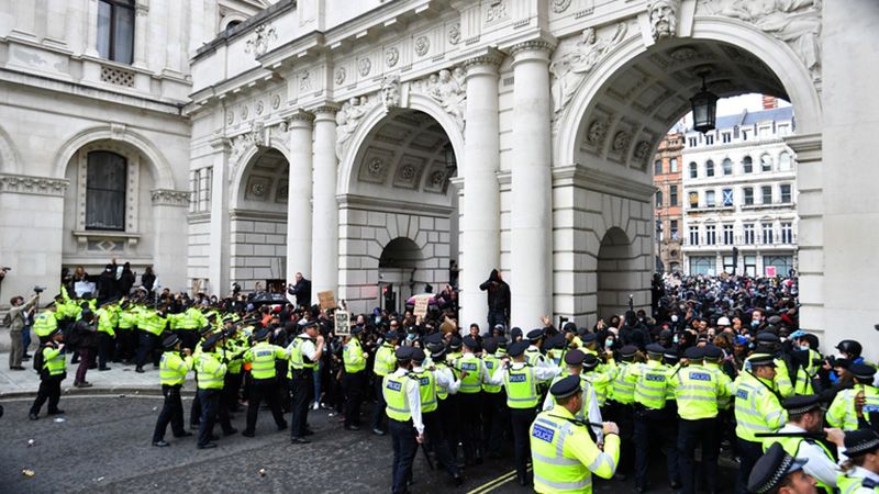 En Whitehall hubo corridas, detenciones y algunos protestantes lanzaron proyectiles contra los uniformados.