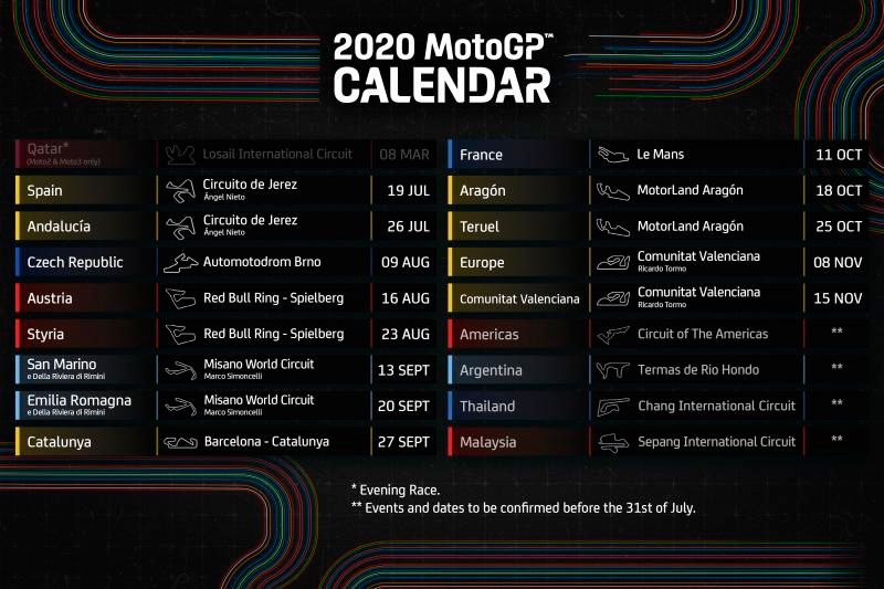 El Moto GP anunció la conformación de su nuevo calendario 2020 y el mismo tiene 13 fechas confirmadas, las cuales son todas en Europa. En tanto, las citas que se realizan fuera de “Viejo Continente” tienen hasta el 31 de julio para ser confirmadas.