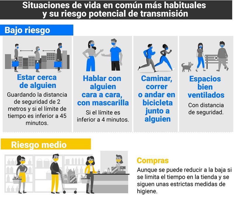 Los CDC analizaron las situaciones de vida en común más habituales y su riesgo potencial de transmisión, en el que la dicotomía interior/exterior, la ventilación del espacio de transmisión, la densidad total de personas en un mismo lugar y la duración de la exposición al virus, son las principales variables a analizar