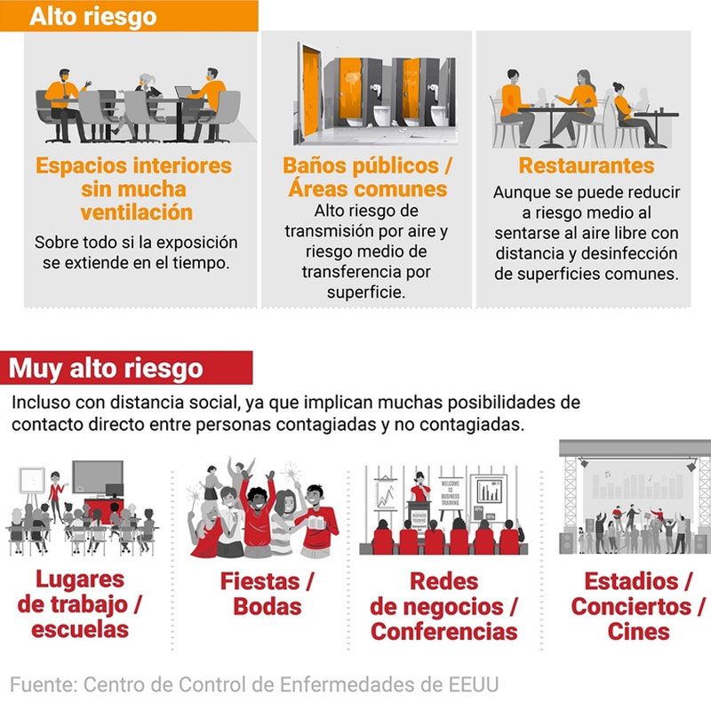 Según explican los responsables, las recomendaciones de los CDC van en consonancia con las medidas que han tomado los diferentes gobiernos a la hora de confinar a la población y cerrar parcial o totalmente la economía de un país. Por un lado, los científicos de este organismo confirman la dicotomía que existe entre lugares cerrados y abiertos a la hora de trasmitir el virus: el riesgo es muy bajo en las actividades al aire libre pero muy alto de reuniones en espacios cerrados, como oficinas, lugares para servicios religiosos, cines o teatros.