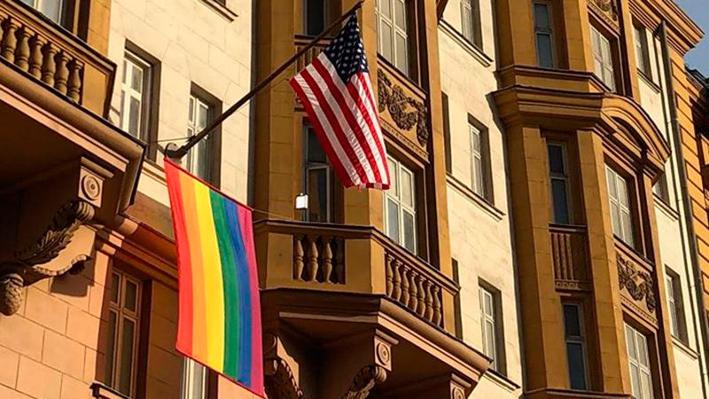 La Embajada de Estados Unidos en Rusia colgó de la fachada la bandera que representa al movimiento LGTBI, a pesar de la ley rusa que prohíbe expresamente cualquier promoción pública de la homosexualidad.