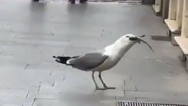 En la grabación, publicada en Twitter, se ve cómo el ave marina camina por una calle con un roedor en la boca, se detiene junto al pavimento y engulle su presa en cuestión de segundos.