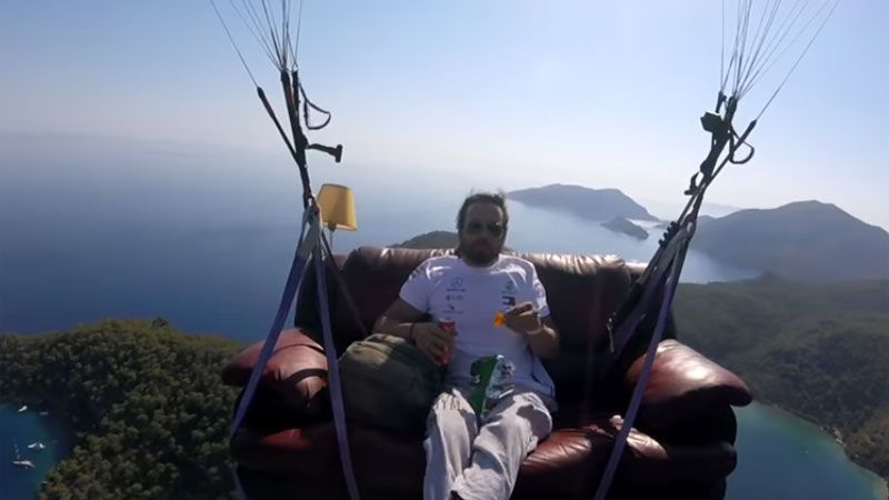 El vloguero turco Hasan Kaval compartió este jueves en su canal de YouTube un inusual video de su vuelo en parapente sentado en un sofá.