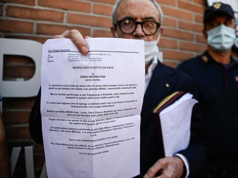 Enseguida las puertas de la clínica Campus Bio Médico de la capital se llenaron de prensa y el abogado y amigo del compositor, Giorgio Assumma, salió para leer una curiosa carta de despedida de Morricone, que será publicada mañana en los principales periódicos del país.