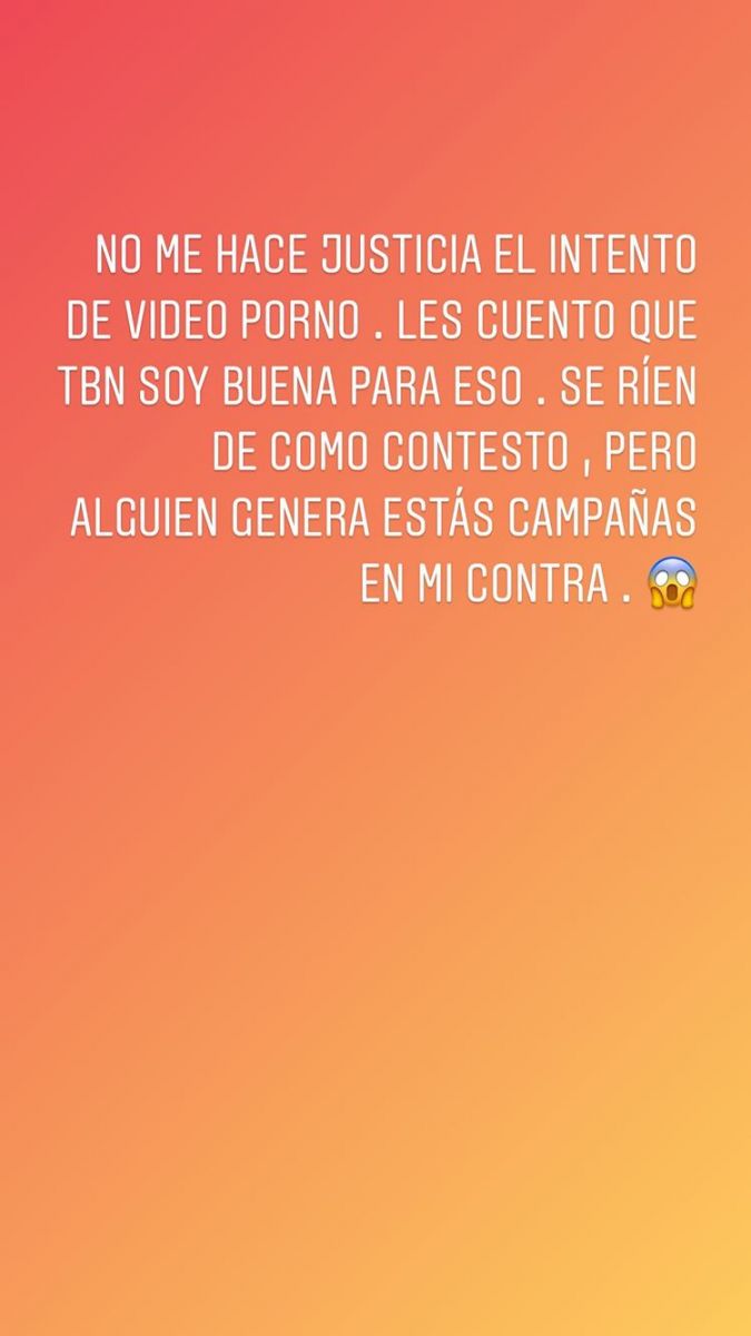 “¿La del video soy yo también? Ja ja ja ja”, indicó en la primera storie difundida en redes sociales. Y afirmó: “No me hace justicia el intento de video porno. Les cuento que también soy buena para eso. Se ríen de cómo contesto, pero alguien genera estas campañas en mi contra”.