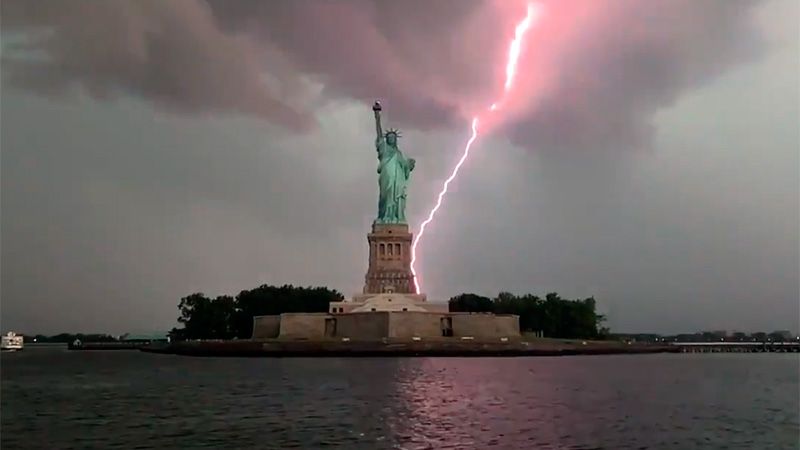 El clip de 21 segundos publicado en Twitter muestra nubes gris oscuro colgando sobre la estatua de la Libertad y dos destellos cruzan el cielo justo a sus espaldas. La escena fue filmada desde un muelle en la isla Ellis.