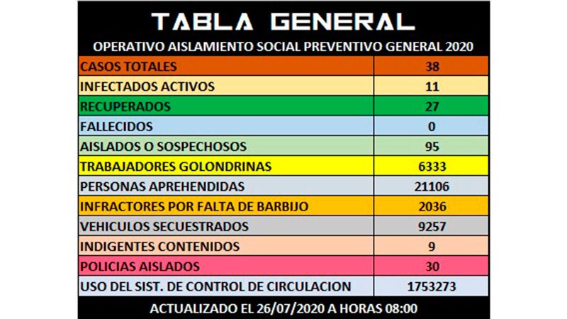 La Policía de la Provincia realizó la tabla general de situación desde marzo -cuando se decretó la cuarentena- hasta la actualidad. Se registraron 38 casos de los cuales 27 se recuperaron. Actualmente hay 11 casos activos y 95 aislados.