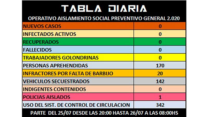 No obstante, 170 personas fueron aprehendidas por violar el aislamiento y el distanciamiento social y se secuestraron un total de 142 vehículos. Además, 20 personas fueron sancionadas por no utilizar el barbijo obligatorio.