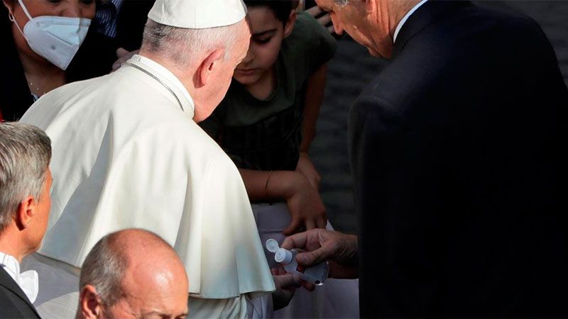 Un asistente puso un poco de desinfectante en las manos del pontífice después de que saludara a la gente y antes de dirigirse a los traductores clericales en el podio. Era la primera vez que se veía al papa en público con barbijo y empleando desinfectante de manos.