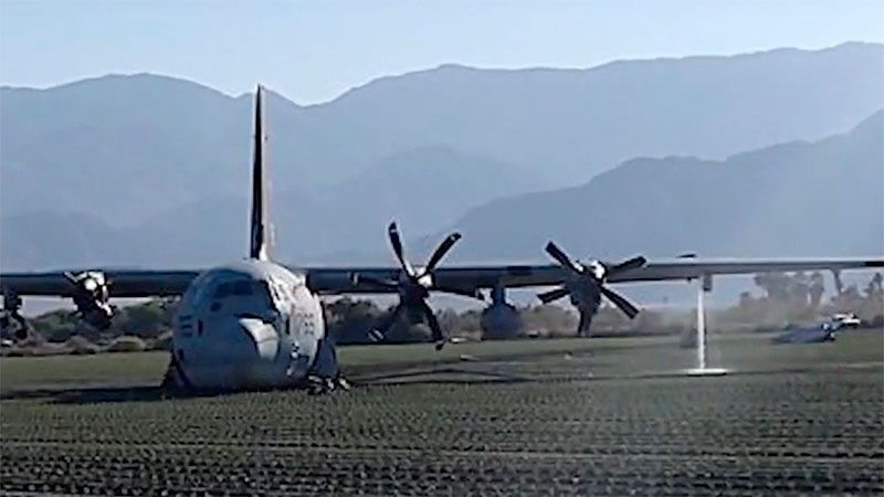 En la Red se han divulgado imágenes de un avión cisterna KC-130J del Cuerpo de Marines de EE.UU., que este martes aterrizó 'de panza' en California tras colisionar con un caza de quinta generación F-35B.