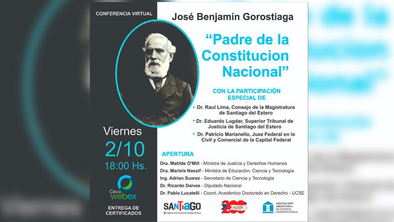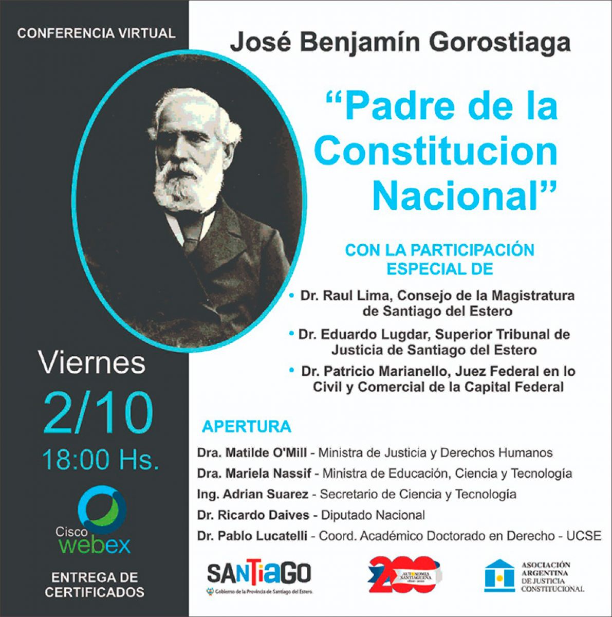 El Gobierno de la provincia a través del Ministerio de Justicia y DD.HH y la Secretaría de Ciencia y Tecnología, junto a la Asociación Argentina de Justicia Constitucional, invitan a participar en el año del Bicentenario de la Autonomía Provincial, de la conferencia virtual sobre el Dr. José Benjamín Gorostiaga “Padre de la Constitución Nacional”, este viernes 2 de octubre, a las 18Hs, a través de la plataforma Cisco Webex y transmitida en vivo.