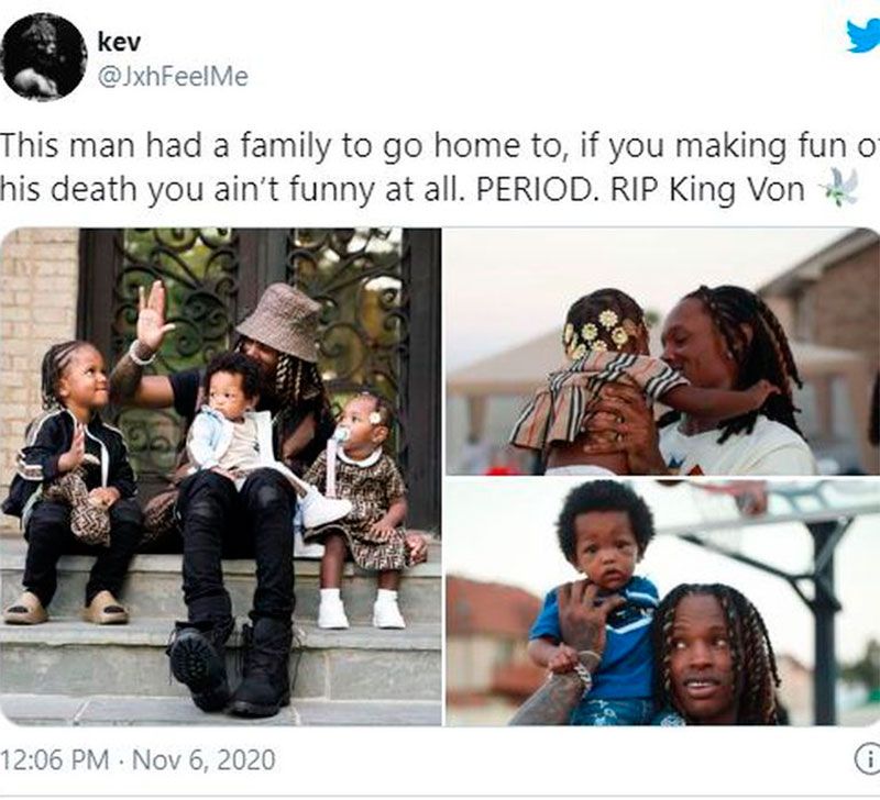 “Este hombre tenía una familia con la que ir a casa, si estás haciendo bromas sobre su muerte, entérate que no eres nada divertido. PUNTO. RIP King Von”, dijo el usuario Kev, quien además compartió la publicación con varias fotografías del rapero con sus tres hijos.
