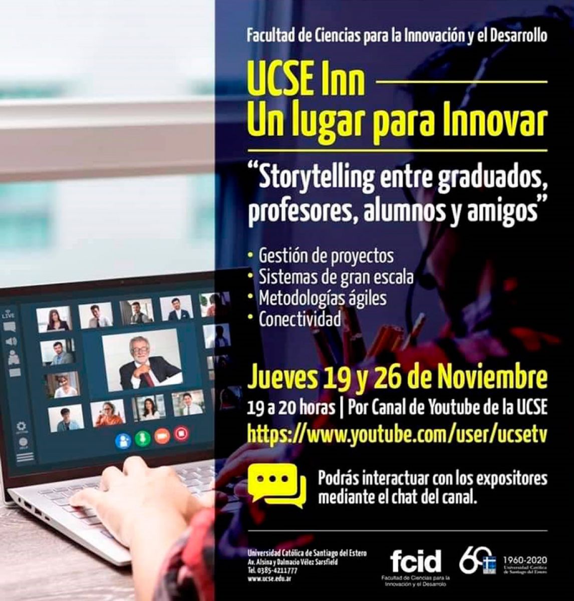 El jueves 19 y 26 de noviembre de 19 a 20hs dará lanzamiento el ciclo llamado UCSE Inn, un nuevo espacio virtual organizado por la Facultad de Ciencias para la Innovación y el Desarrollo, en el que graduados, docentes, alumnos y amigos presentarán iniciativas de innovación vinculadas con su actividad profesional, laboral, científica, y académica. En esta oportunidad desde el conocimiento de la Informática.