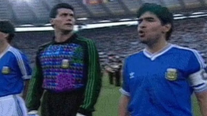 El rostro de Maradona representaba la bronca que sus compañeros no pudieron (o no quisieron) demostrar. Incrédulo, observó las tribunas del estadio mientras los silbidos, acompañados por insultos hacia el 10, se hacían cada vez más grandes. Cuando la transmisión lo tuvo a él en primer plano, Pelusa largó una serie de insultos que quedaron grabados en la mente de todos y que respondieron a los abucheos al himno y a los insultos de algunos italianos que estaban en contra de Diego. La faceta más argentinista de Maradona salió a la luz en esos segundos que el mismo jugador fue testigo del desprecio de los europeos no sólo hacia Argentina, sino también contra su propia figura y uno de los símbolos patrios más importantes del país. El 10 masticó bronca, no pudo hacer más que demostrar su enojo mediante insultos y salió a jugar el partido con un solo objetivo: ganar esa bendita Copa.