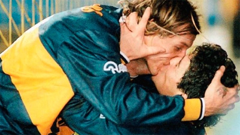 Cani y Maradona se reencontraron al final de sus carreras en Boca, donde demostraron el amor que los unía con un "piquito" en el festejo de un gol.