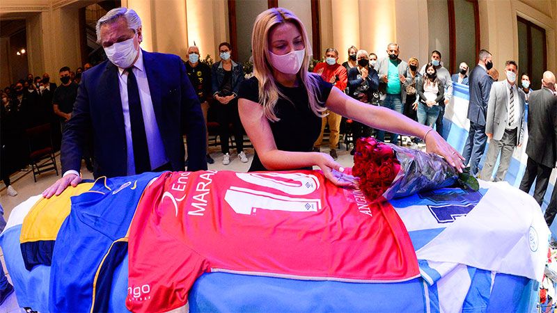 El presidente Alberto Fernández asistió esta mañana al velorio de Diego Maradona que se desarrolla en la Casa de Gobierno, acompañado por la primera dama Fabiola Yañez y funcionarios del gabinete nacional.