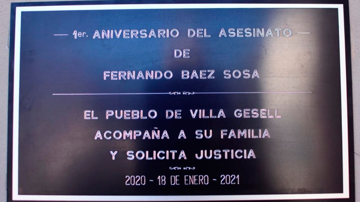 "1er. aniversario del asesinato de Fernando Báez Sosa. El pueblo de Villa Gesell acompaña a su familia y solicita Justicia", dice la placa en homenaje al joven de 18 años, que fue colocada esta mañana durante un acto en el que estuvo presente el intendente de esa ciudad, Gustavo Carrera; el jefe de Gabinete, Cristian Angelini; y la directora de Gobierno, Sofía Tineo.
