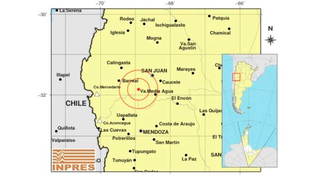 El epicentro fue en la localidad de Media Agua, en Sarmiento, San Juan; a 52 kilómetros al Suroeste de la Capital. Tuvo una profundidad de 128 kilómetros. Ocurrió a las 23:46.