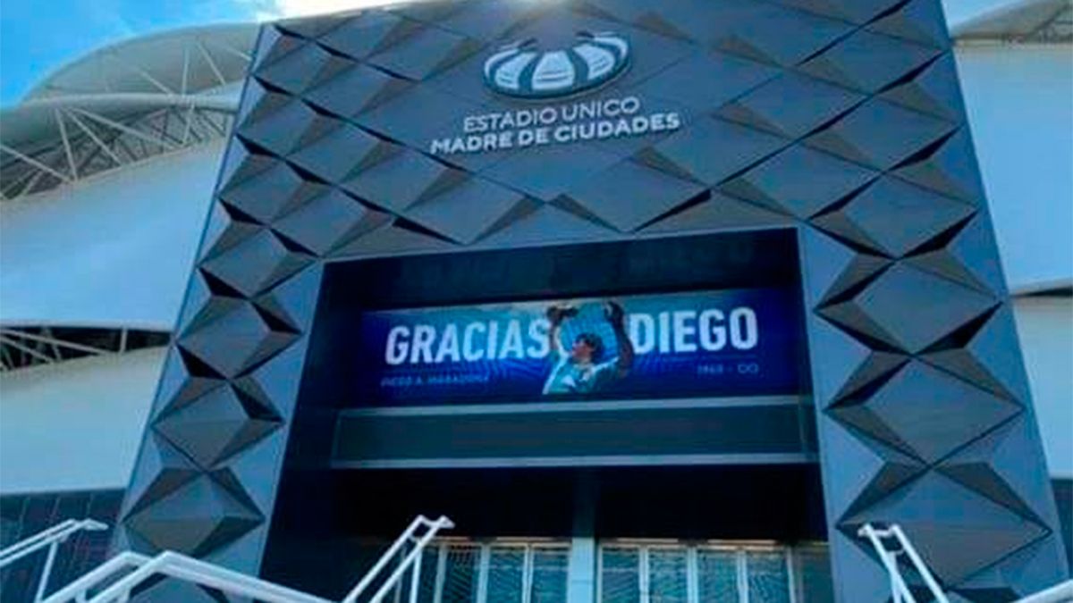 Y el Estadio Único “Madre de Ciudades” de Santiago del Estero no es la excepción. En el acceso principal al imponente estadio santiagueño se puede observar la imagen de Diego tras consagrarse campeón mundial en México en el año 1986.