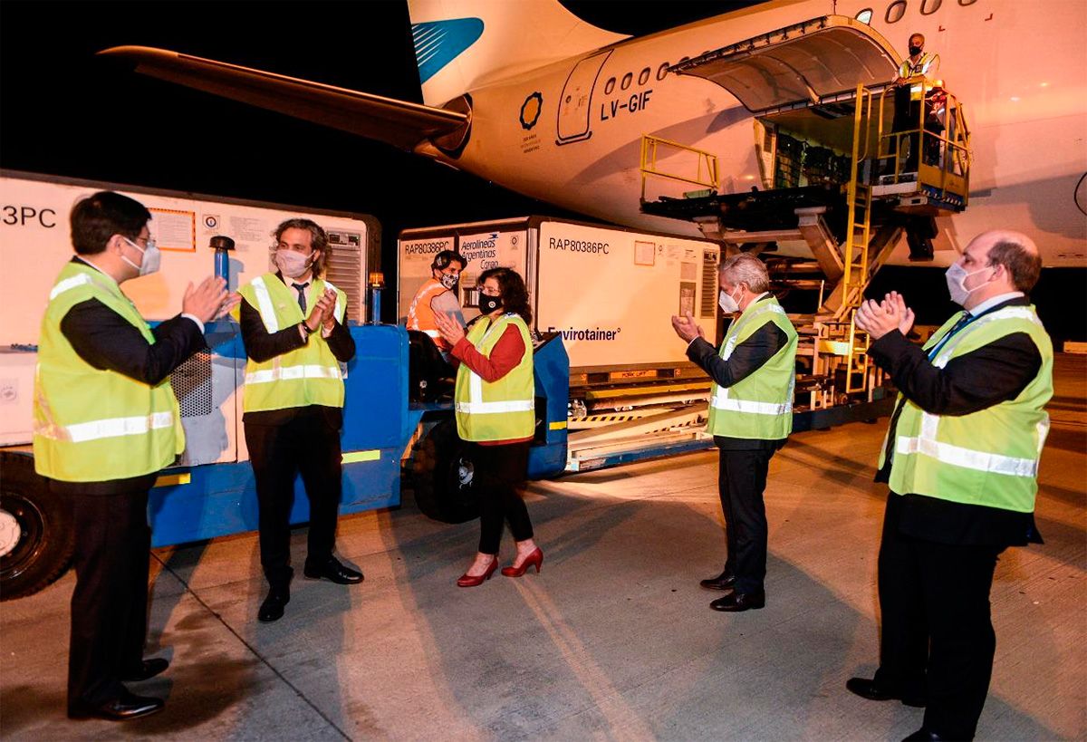 El vuelo fue recibido por el jefe de Gabinete, Santiago Cafiero; la ministra de Salud, Carla Vizzotti, el canciller Felipe Solá y el embajador chino en el país, Zou Xiaoli.
