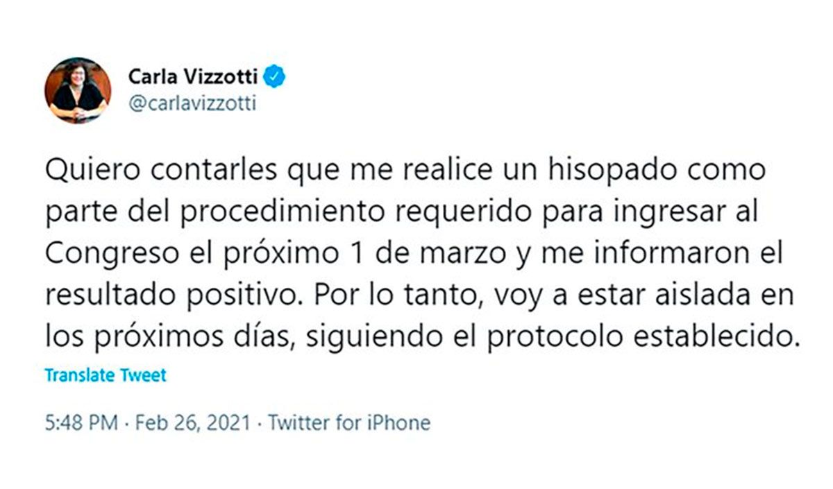 “Quiero contarles que me realice un hisopado como parte del procedimiento requerido para ingresar al Congreso el próximo 1 de marzo y me informaron el resultado positivo. Por lo tanto, voy a estar aislada en los próximos días, siguiendo el protocolo establecido”, contó la funcionaria, que asumió en su nueva función hace seis días.