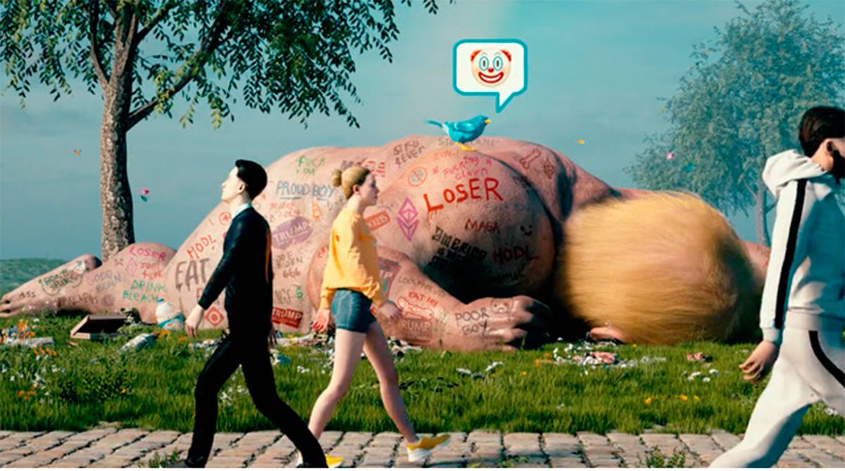El video generado por computadora vendido por Rodríguez-Fraile muestra lo que parece ser un Donald Trump gigante colapsado en el suelo, su cuerpo cubierto de lemas, en un entorno idílico.