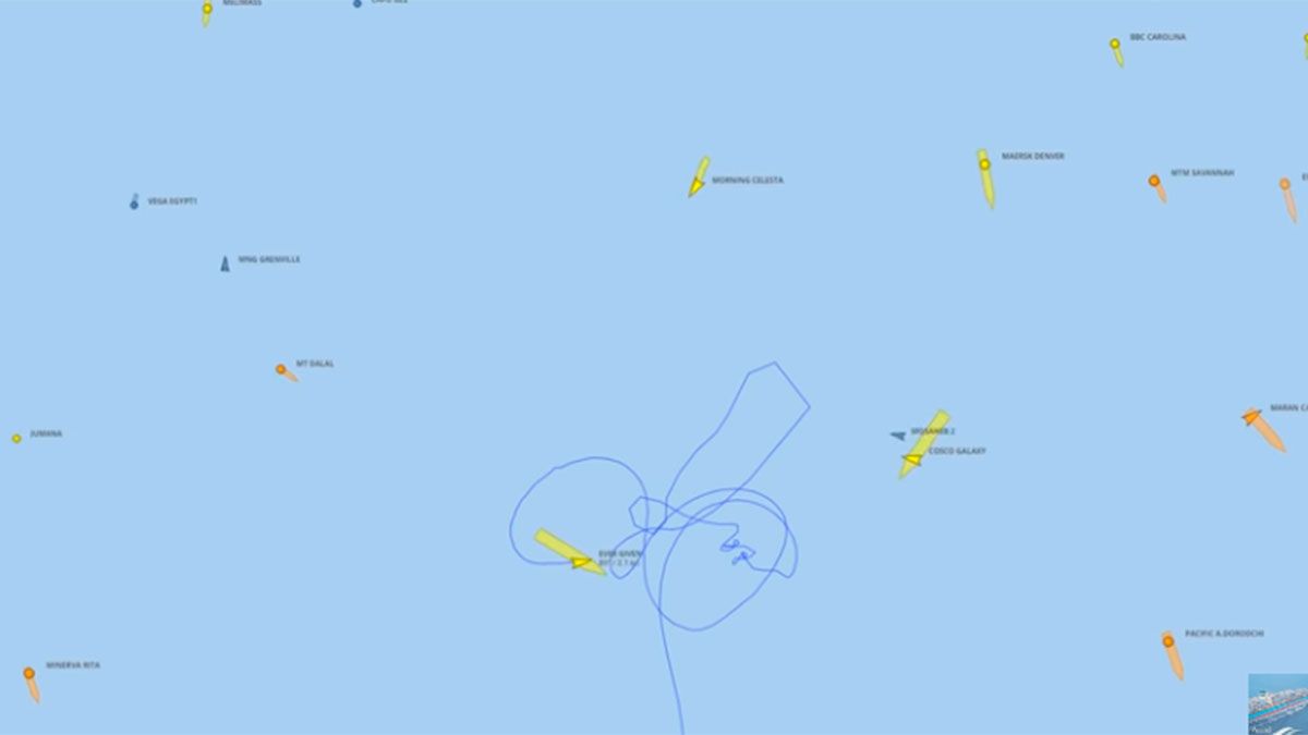 La imagen proviene de un video creado por el proveedor de servicios de tráfico de embarcaciones VesselFinder.com. El video muestra los movimientos del Ever Given mientras esperaba su turno para ingresar al Canal de Suez.