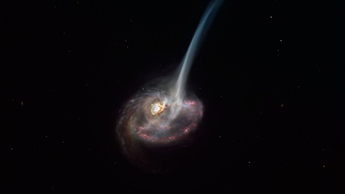 Así, los astrónomos se toparon con esta galaxia moribunda por mero accidente. Mientras observaban una centenar de galaxias en lugares distantes, notaron algo extraño precisamente en la galaxia ID2299. Lo vieron durante unos minutos: la galaxia tenía una cola de gas que estaba siendo expulsada, que es precisamente la instantánea (recreación artística, por supuesto) que acompaña este artículo. El gas estaba siendo expulsado a un ritmo sorprendente, el equivalente a 10.000 soles al año.