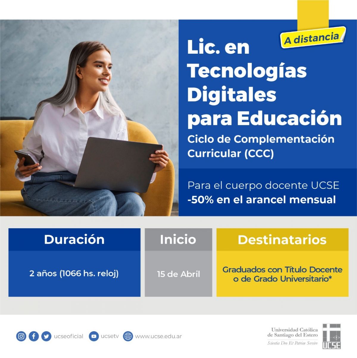 La Licenciatura en Tecnologías Digitales para Educación es una nueva propuesta académica de la UCSE, con modalidad a distancia para que puedas estudiar desde tu casa. Tiene una duración de 2 años, el plan de estudios se organiza en 11 obligaciones académicas y un Trabajo Final Integrador. Las clases comienzan el 15 de abril.
