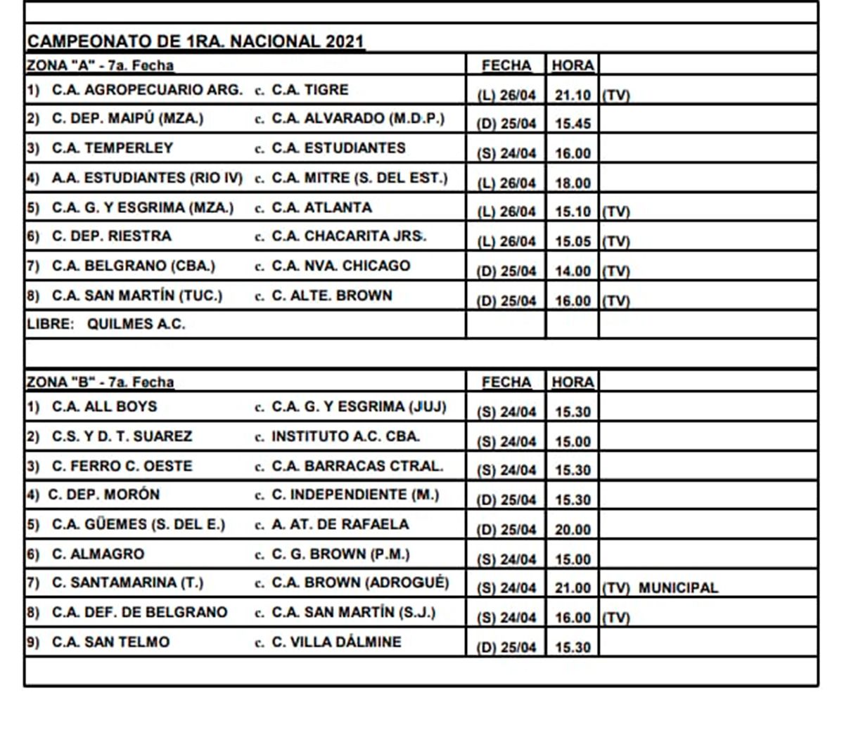 Este domingo se confirmó la programación de la séptima fecha de la Primera Nacional.