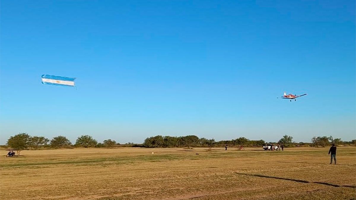 La iniciativa de sobrevolar el cielo de la Capital de la Tradición, estaba programada para las 16 horas, pero la avioneta agrícola tuvo que realizar tres intentos hasta poder enganchar la Bandera, y finalmente despegó con el símbolo patrio cerca de las 17:30 horas.