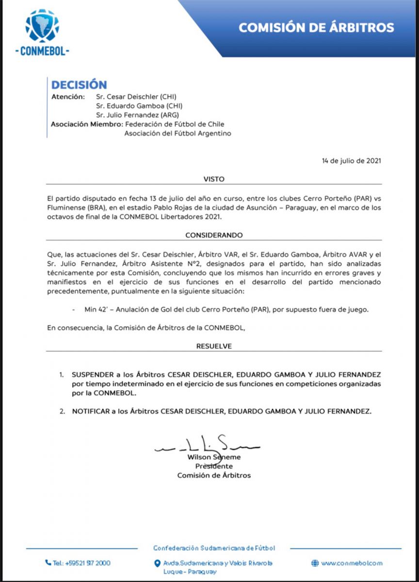 En tanto, el mismo organismo también procedió a suspender “por tiempo indeterminado” a los árbitros chilenos César Deischler y Eduardo Gamboa (los dos afectados al VAR) y al argentino Julio Fernández, asistente 2 del principal Facundo Tello, en el encuentro de la noche del martes entre Cerro Porteño 0-Fluminense 2, en Paraguay.
