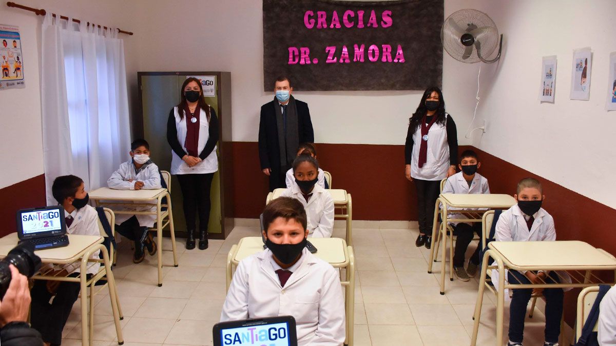 Acompañado por alumnos y la directora Laura Rojas, el Gobernador Zamora llevó a cabo el corte de cinta y el descubrimiento de una placa, para luego comenzar con la visita por las nuevas obras con las que cuenta la escuela. Así recorrió las aulas, sala de informática y demás, en donde junto a las demás autoridades y la directora de la escuela observó con detenimiento cada uno de los nuevos elementos con los que contarán los alumnos de dicha institución, y que les permitirá estar a la altura de cualquier edificio escolar ya sea de la Capital o Banda, brindándoles, de esta manera, las mismas herramientas a todos los jóvenes alumnos de toda la Provincia, a lo largo y a lo ancho del territorio santiagueño, haciendo especial hincapié en una política de estado firme, que tiene la inclusión social y la educación como pilares de esta gestión de gobierno.