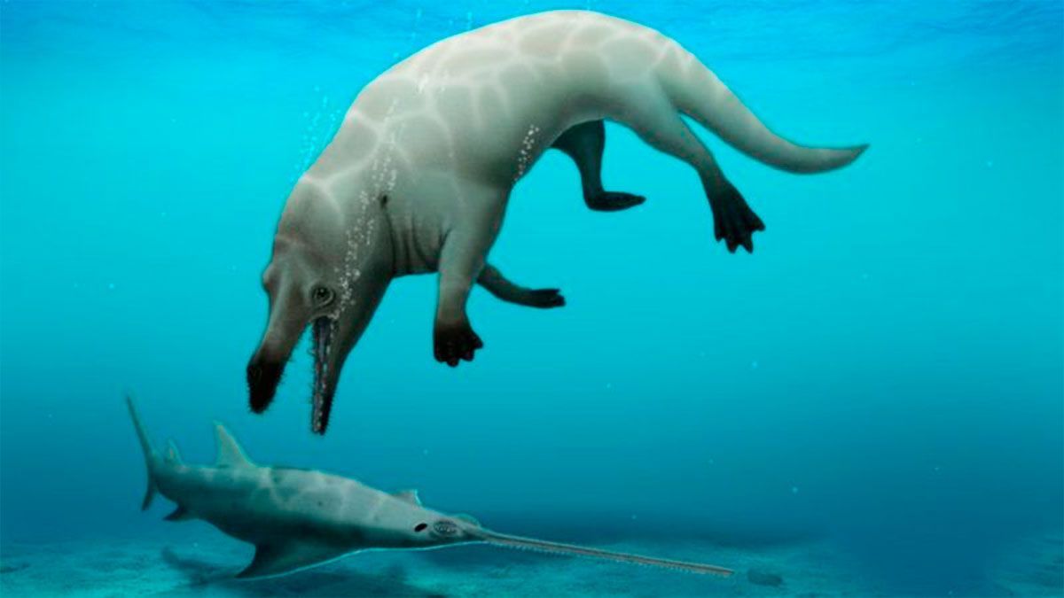 El arcaico anfibio, que además de nadar también caminaba por la tierra, es considerado un antepasado de las ballenas modernas.