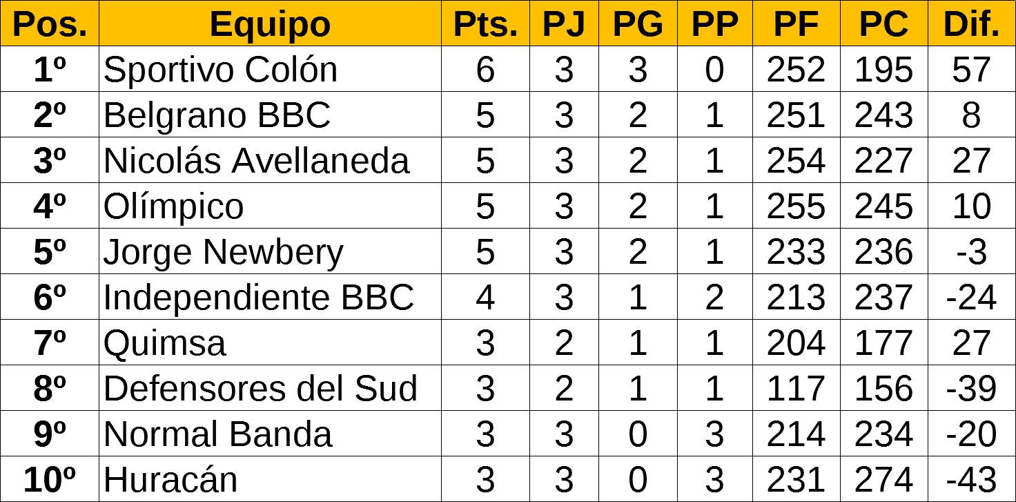 Los otros dos invictos del certamen tuvieron una mala noche. Olímpico fue derrotado como visitante por Nicolás Avellaneda por 78-72, en tanto que Jorge Newbery cayó de local ante Belgrano, que ahora se mete en el lote de escoltas junto al Celeste.