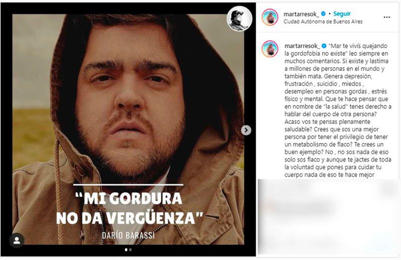 “‘Mar te vivís quejando la gordofobia no existe’ leo siempre en muchos comentarios. Sí existe y lastima a millones de personas en el mundo y también mata. Genera depresión, frustración, suicidio, miedos, desempleo en personas gordas, estrés físico y mental. ¿Qué te hace pensar que en nombre de ‘la salud’ tenés derecho a hablar del cuerpo de otra persona? ¿Acaso vos te pensás plenamente saludable? ¿Creés que sos una mejor persona por tener el privilegio de tener un metabolismo de flaco? ¿Te crees un buen ejemplo?”, escribió Tarrés en su cuenta de Instagram.