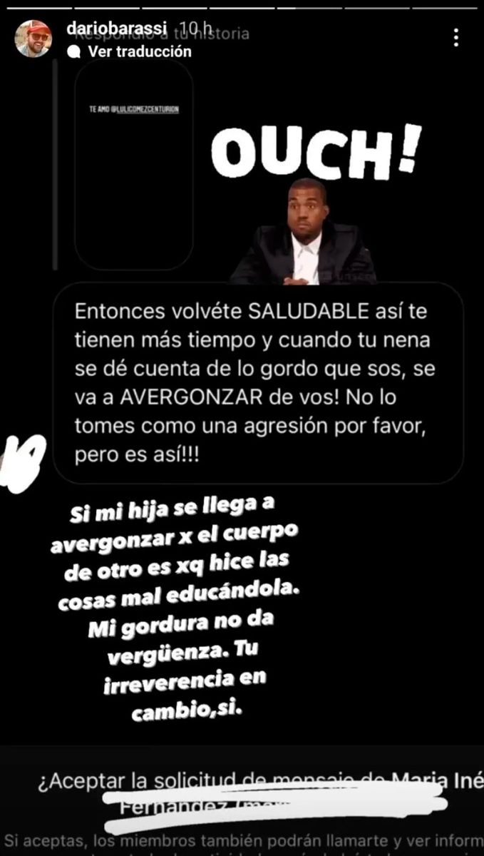 Darío Barassi se encontró con un mensaje de Instagram donde además de cuestionar su sobrepeso se metían con su hija y no dudó en salir al cruce. “Volvete saludable, así te tienen más tiempo y cuando tu nena se de cuenta de lo gordo que sos, ¡se va a avergonzar de vos! No lo tomes como una agresión por favor, pero ¡es así”, le dijo la mujer.