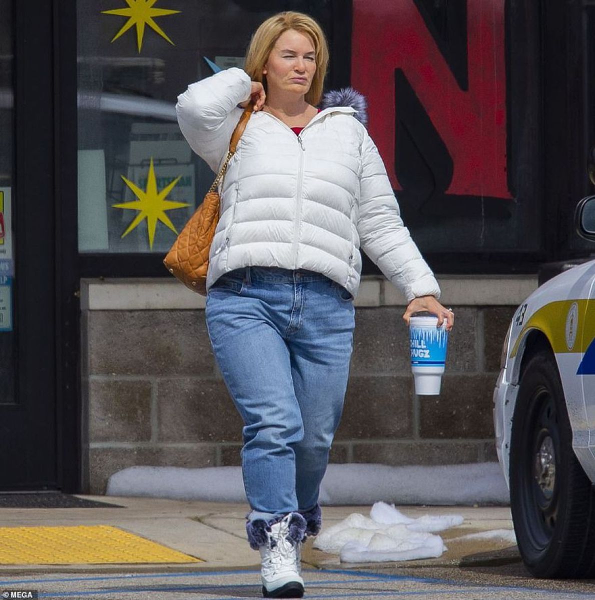 Entre las imágenes que circularon en medios estadounidenses y en las redes sociales, se puede ver a Zellweger con el abultado traje cubierto por una blusa de color rojo, jeans y botas blancas de nieve. Además, parece llevar una prótesis nasal para asemejarse aún más al rostro de Hupp.