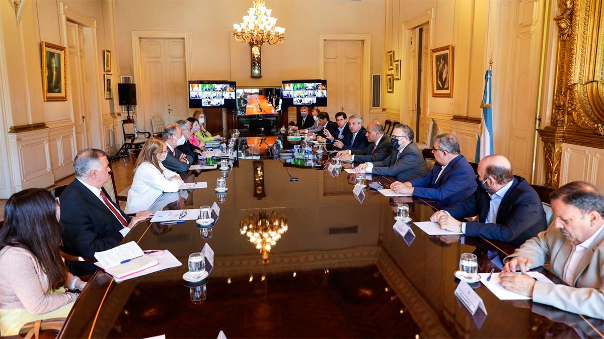 La reunión se realizó bajo modalidad presencial y virtual, el Salón Eva Perón de la Casa de Gobierno, con la presencia del jefe de Gabinete, Juan Manzur, y el ministro del Interior, Eduardo "Wado" de Pedro.