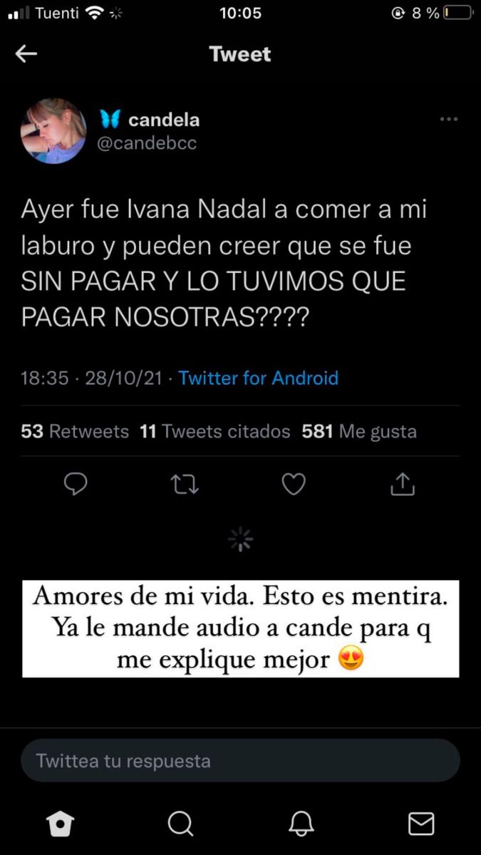 Ivana Nadal volvió a sufrir otro ataque en las redes sociales. Le avisaron que una chica había dicho en Twitter que se fue sin pagar del restaurante donde trabajaba y se contactó con ella de inmediato para aclarar la situación. Vía Instagram le pidió explicaciones y luego publicó una captura para que vieran que no es ninguna “rata”.