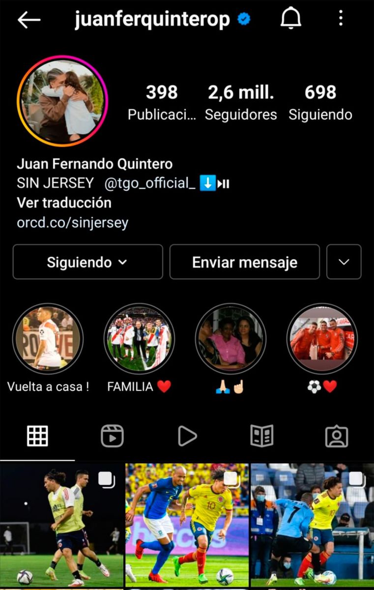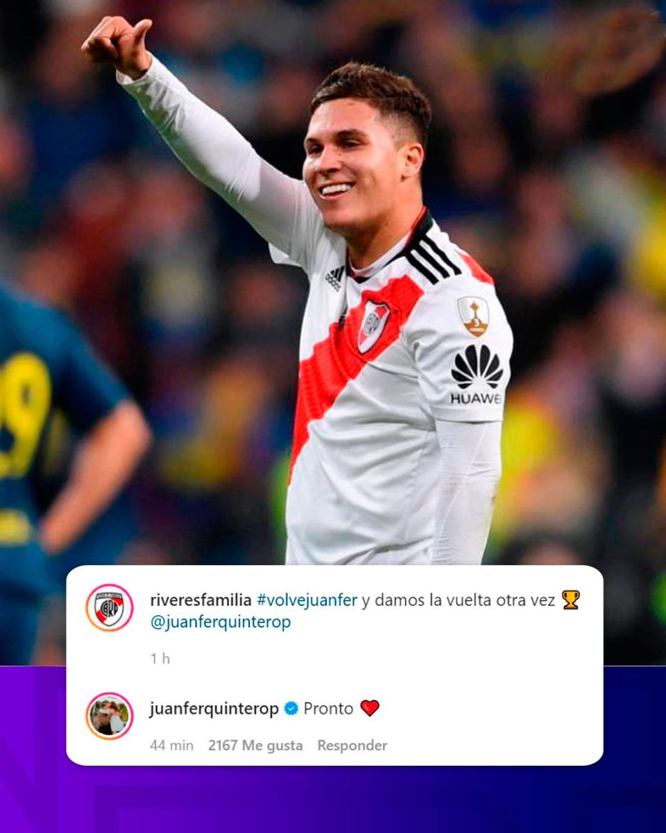 La cuenta de Instagram @riveresfamilia subió una foto del mediocampista cafetero en el festejo de aquella recordada final de la Copa Libertadores 2018 en Madrid, en la que se lo ve a Quintero con con la medalla colgada en el cuello, los brazos bien arriba, puños cerrados y una sonrisa de oreja a oreja que pareciese indeleble. "#volvejuanfer y damos la vuelta otra vez @juanferquinterop", reza la publicación.