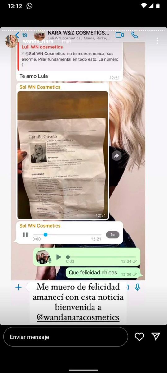 “Me muero de felicidad. Amanecí con esta noticia: bienvenida a Wanda Cosmetics”, escribió la blonda en su cuenta de Instagram después de que le informaran que habían contratado a la joven. “Wanda, le cumpliste el sueño a Camila Oliveto, ya la contratamos”, se escucha en el audio que le mandaron las encargadas del local situado en el Abasto.