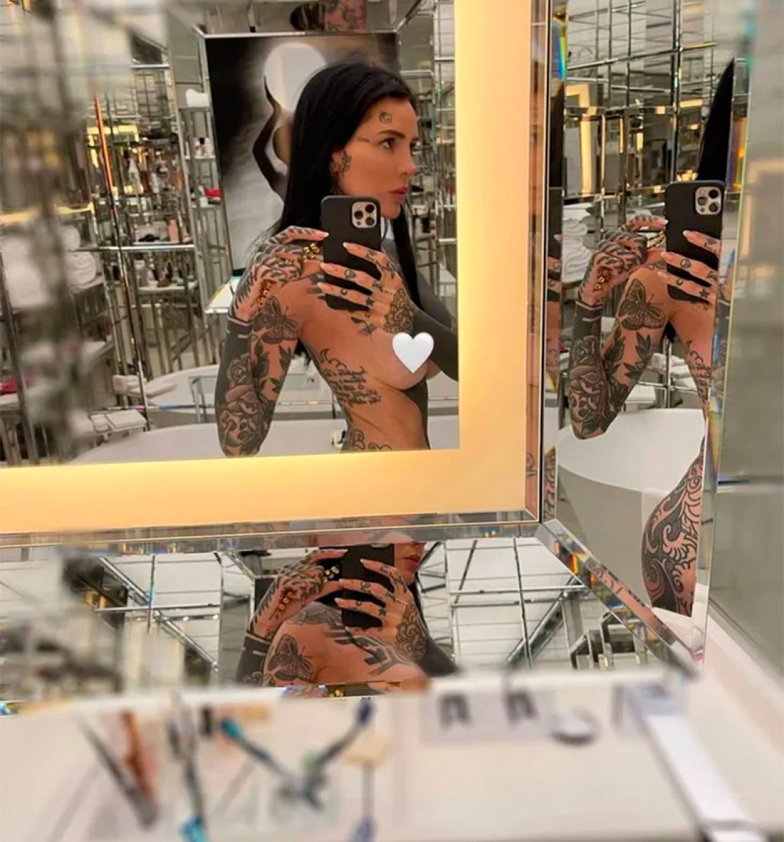 Cande posó frente al espejo del baño de su habitación de hotel y no llevaba nada puesto; reveló cada una de sus curvas y tatuajes y agregó un emoji de corazón blanco tapando lo prohibido.