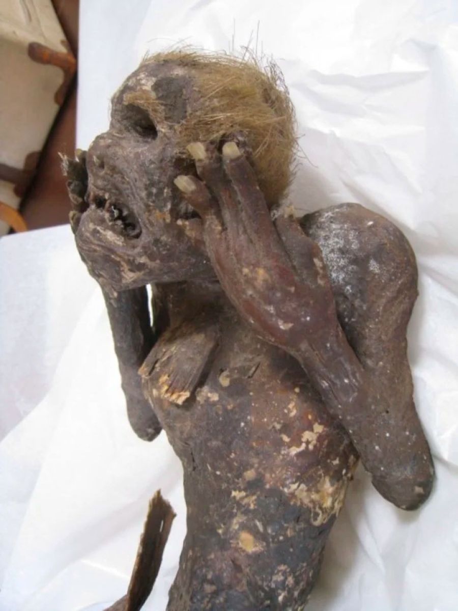La criatura tiene sus dos manos extendidas hacia su rostro gesticulante. Todavía se ve algo de cabello en su cabeza y posee restos de dientes afilados y puntiagudos en la boca, revelan medios británicos.